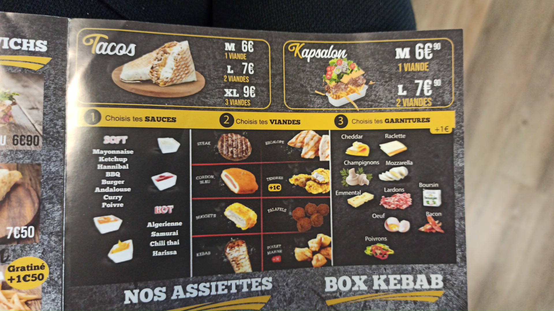 C'est la deuxième fois que l'on commande chez eux , la première fois on était déjà déçu mais bon peut être que c'était un mauvais jour . En faite non encore déçu , très mal servi , les barquettes de kapsalon pas rempli et il manquait les légumes . La barquette M est plus grand que le L on a pas compris . On a fini de manger et on a encore faim c'est fou . Le plus heureux c'est mon fils menu enfant parfait il a 3 ans . C'est la dernière fois que l'on commande chez eux
