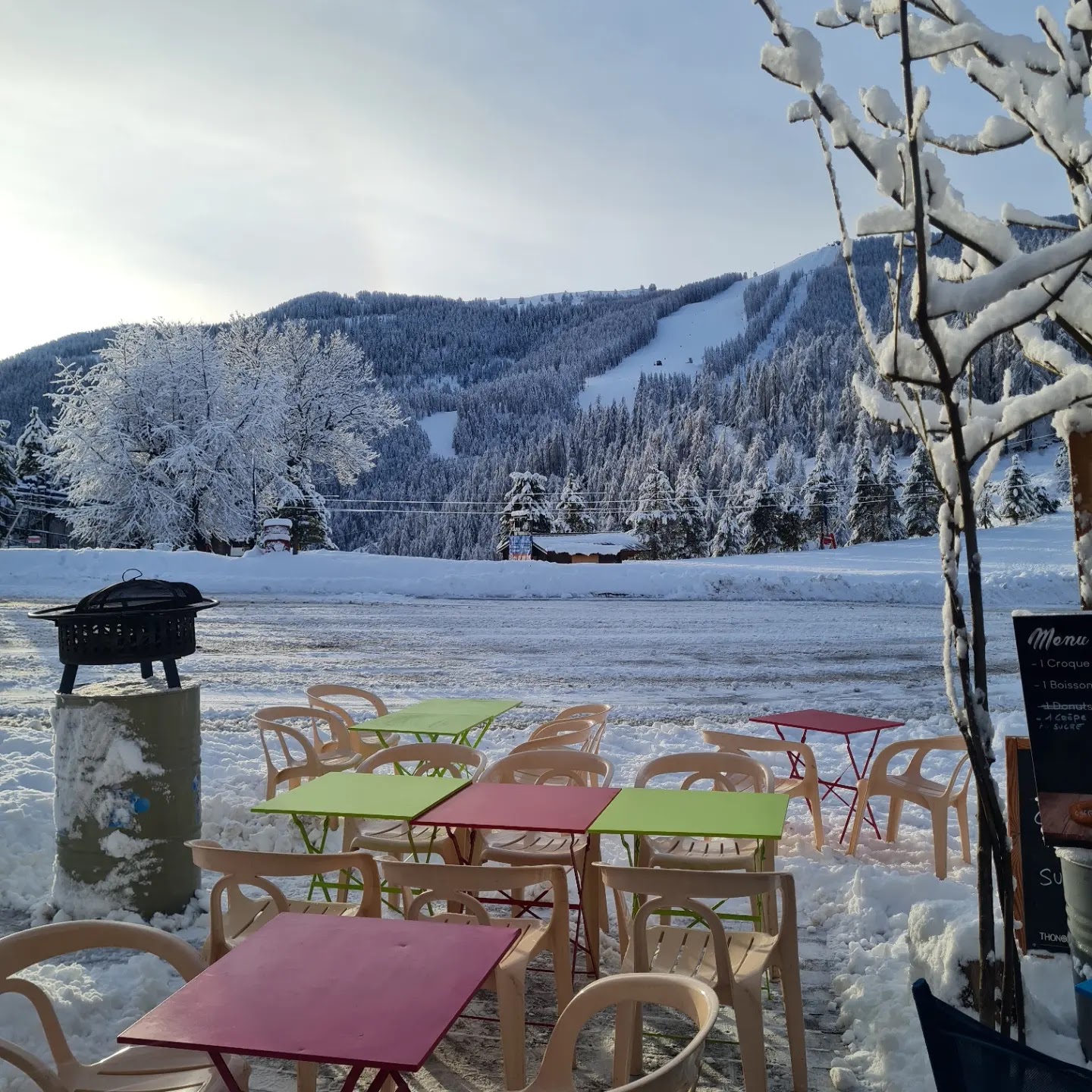 Très bon endroit où se retrouver en bas des pistes. Très confortable de s'y poser, entre un ruisseau au son apaisant et une très belle vie sur deux pistes et du soleil. Très bonne frites