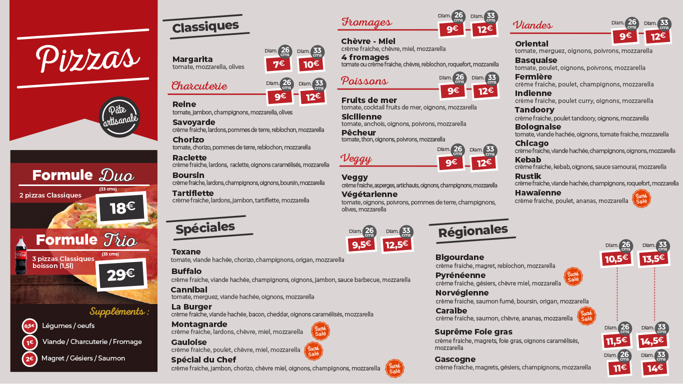Carte très complète. Pizza vraiment bonnes et programme de fidélité (1 pizza moyenne gratuite pour 8 achetées) très intéressant.