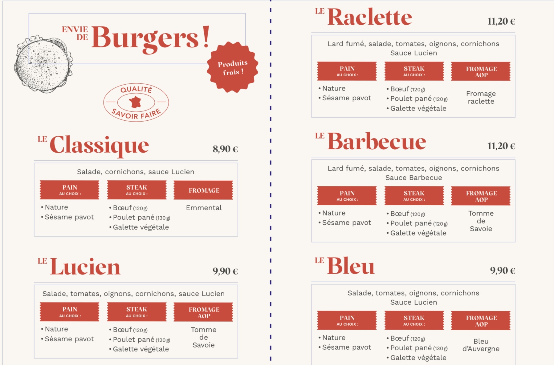 Excellent! Les frites sont fraîches et rousses à souhait, le burger chez Lucien à tomber par terre, le meilleur du coin de plus équipe sympathique et souriante, le Mr a même offert des bonbons à notre fils. Nous reviendrons '.