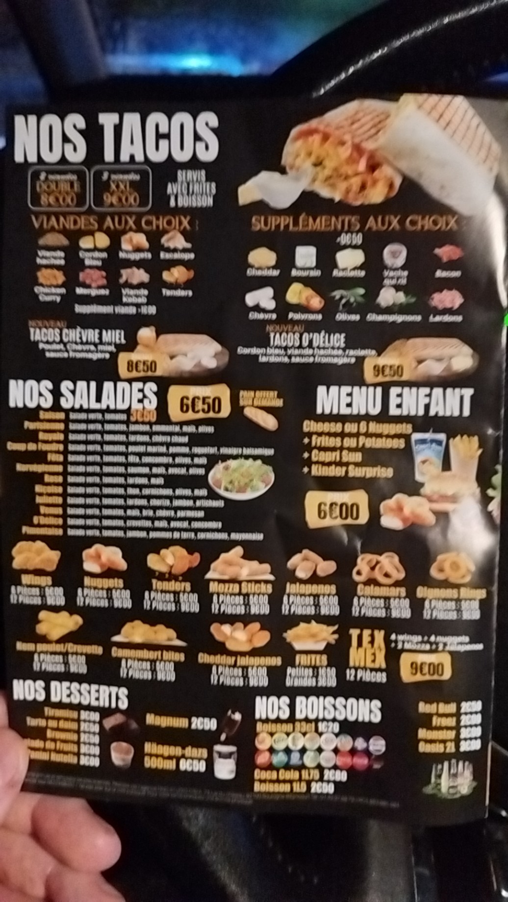 Franchement super ! Livraison dans les délais, je ne m’attendais pas à avoir un repas aussi copieux même le plus grand de mes mangeurs à caler en chemin. En général je prends toujours une deuxième part de frites dans mes menus burgers (mc do etc..) mais là je regrette clairement lol 😂 . Les tacos sont excellents et autre petite surprise il y avait une part de frites intégré 🥰 seuls petits bémols je trouves les frites un peu molles et surtout vous avez oublié ma boisson sachant que j’avais vraiment envie de ce Sprit ça m’a effectivement contrarié mais bon se sera pour la prochaine fois.